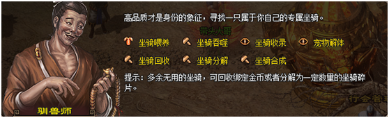 1、  坐骑喂养,给坐骑食用道具,可提升坐骑的成长等级,等级越高,可领悟的属性就越好